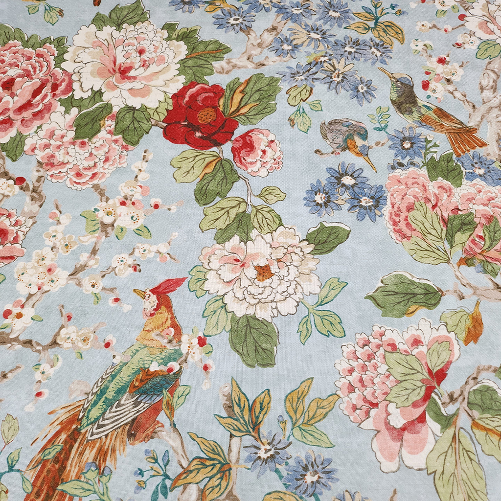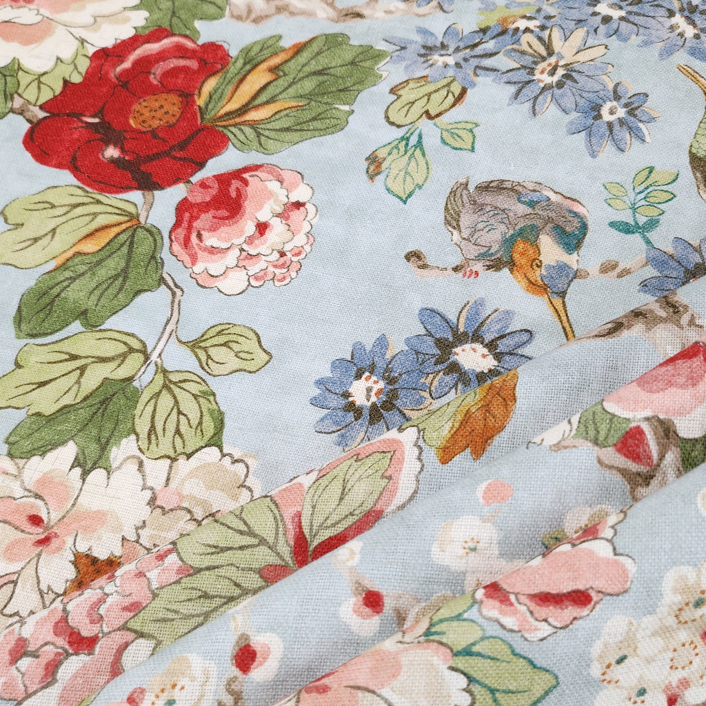 This fabric has a vibrant and colourful design, displaying birds perched on branches surrounded by blossoming flowers and is printed on linen.