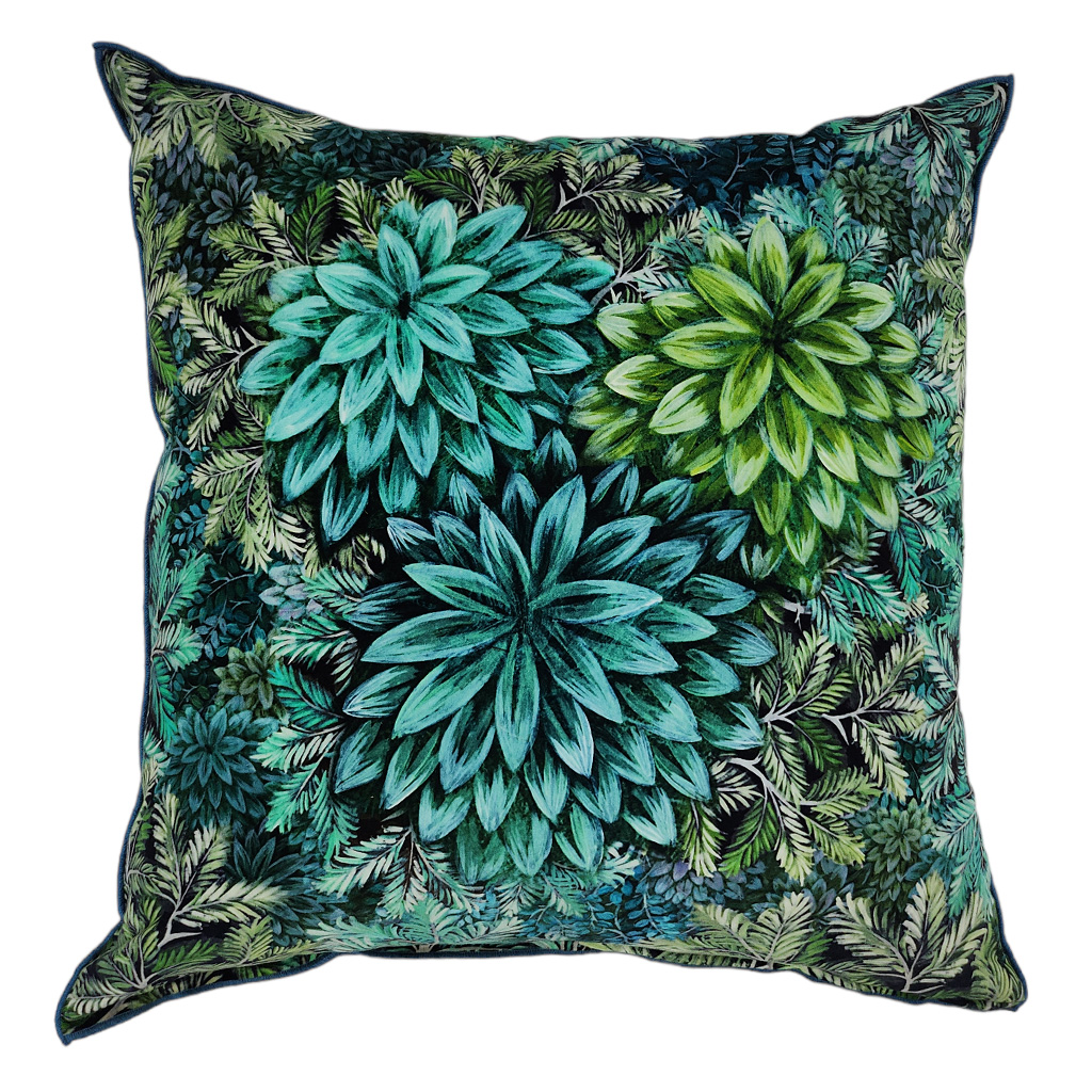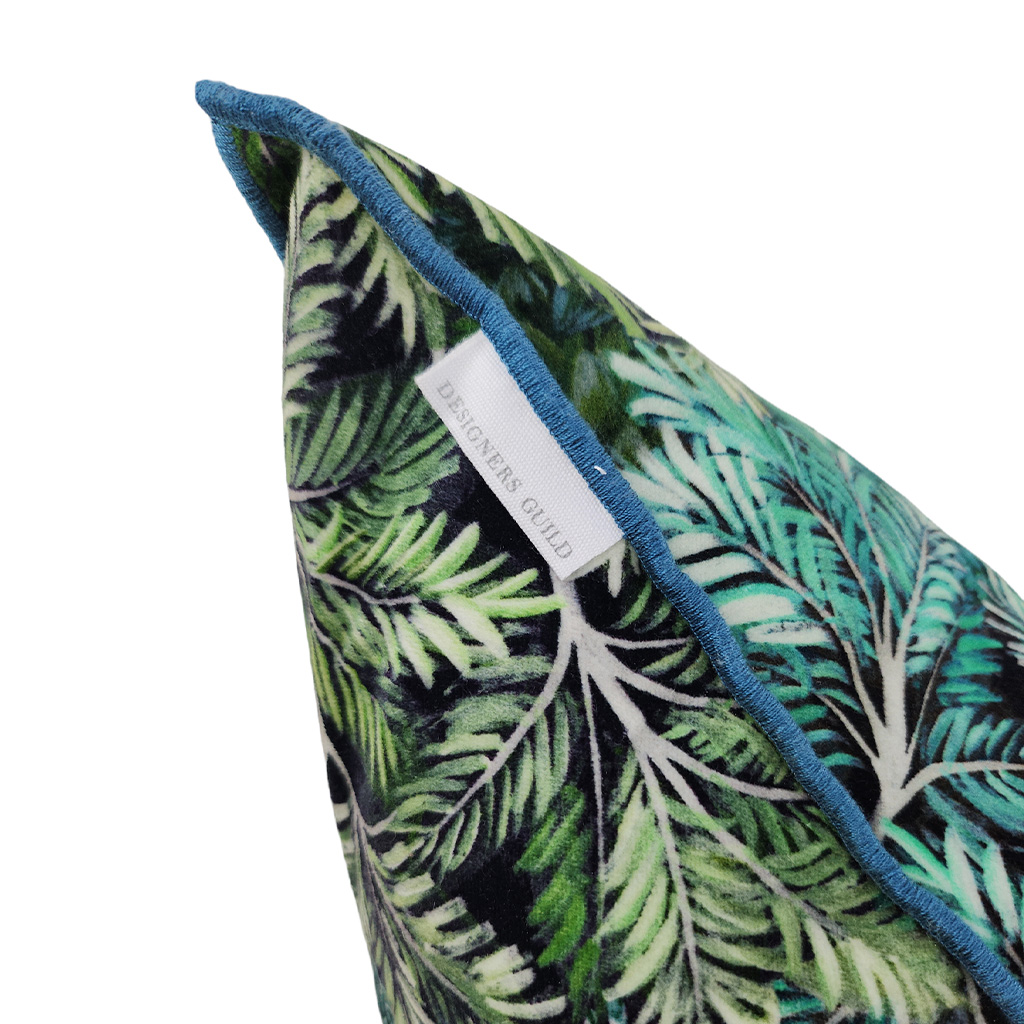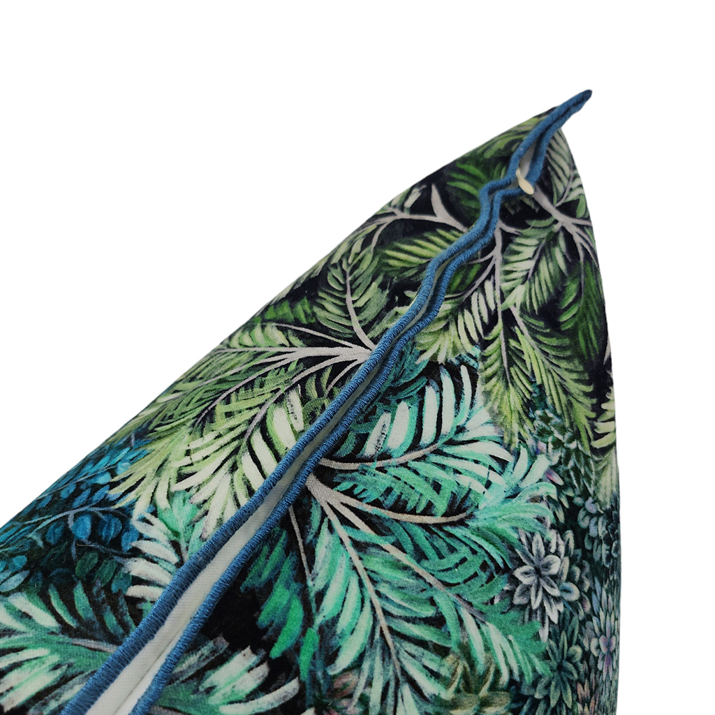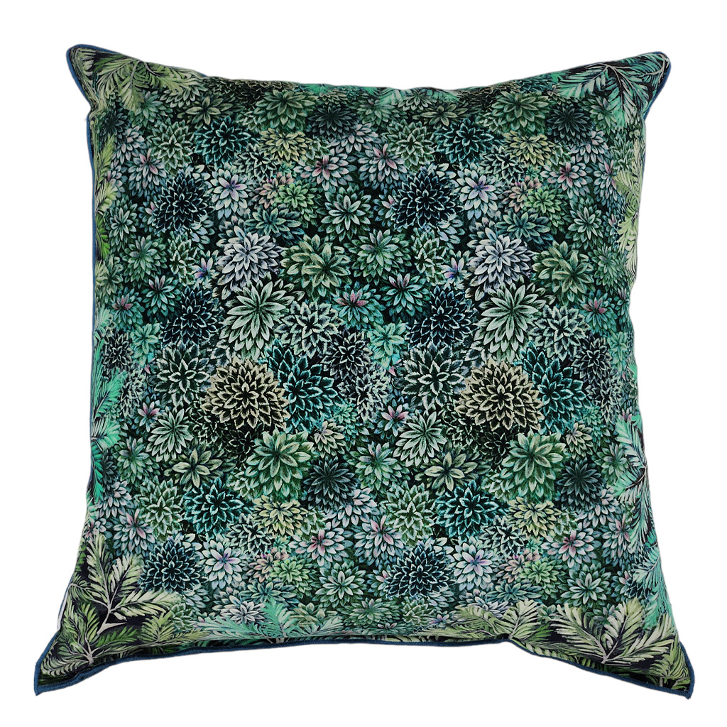 A luxurious cotton rich velvet cushion, bringing the outdoors in with it’s stunning forest of leaves and its deep emerald colours.