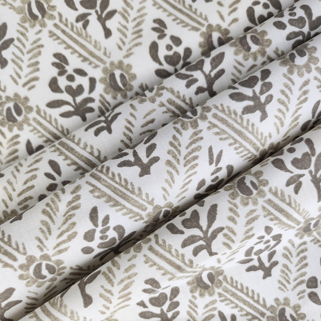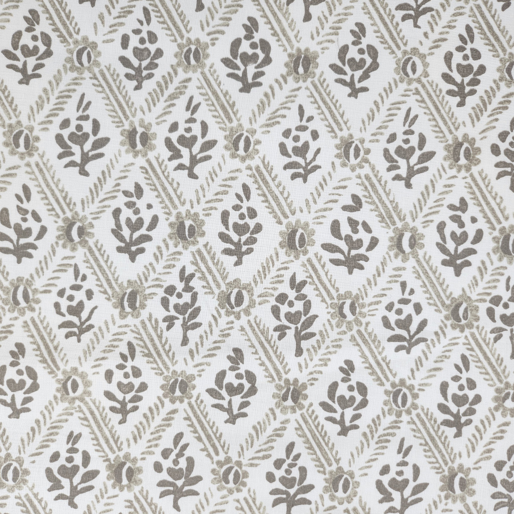A small scale trellis pattern with stamped effect floral motifs, traditionally rotary printed on a pure fine cotton.