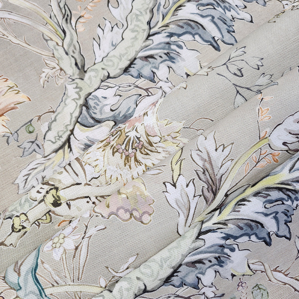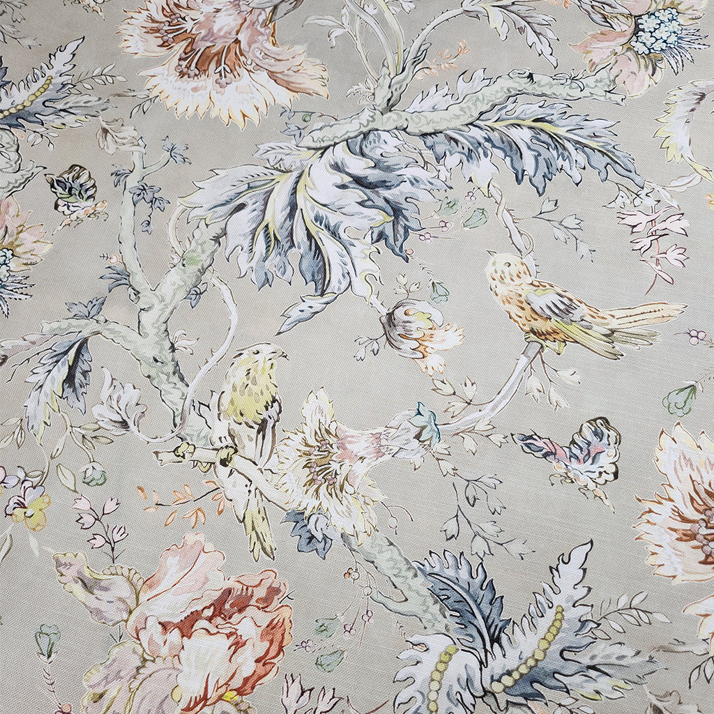 A digitally printed design of birds and butterflies in medium scale. Printed onto a softly textured cotton.