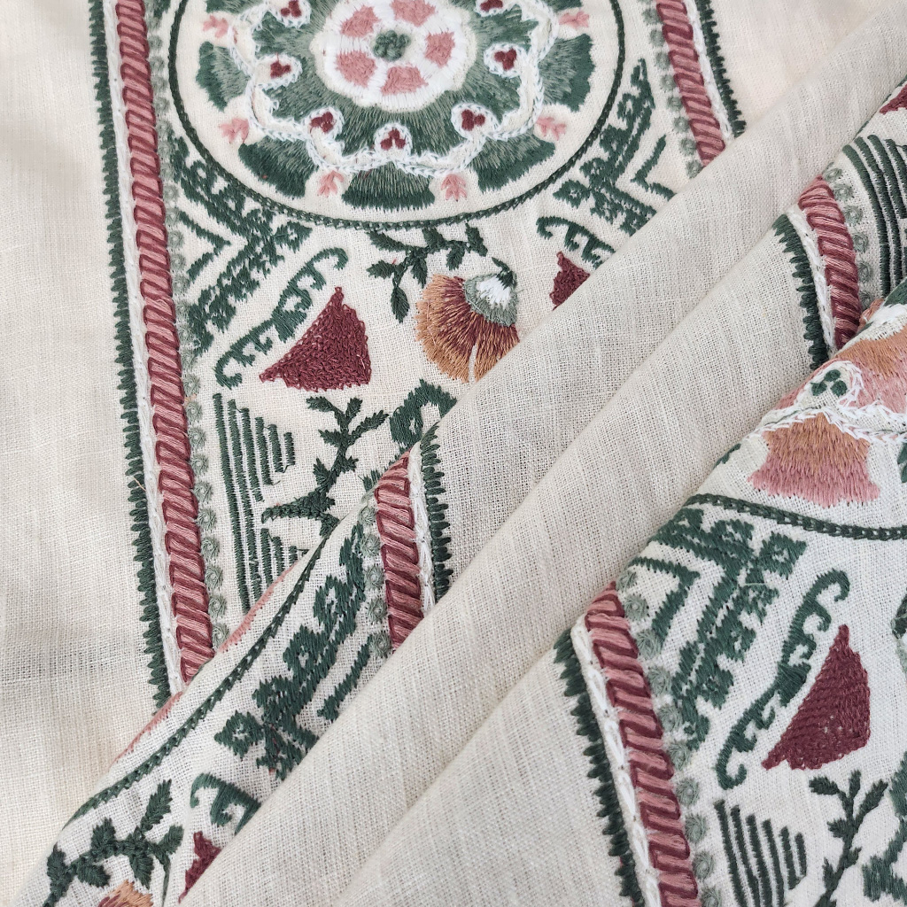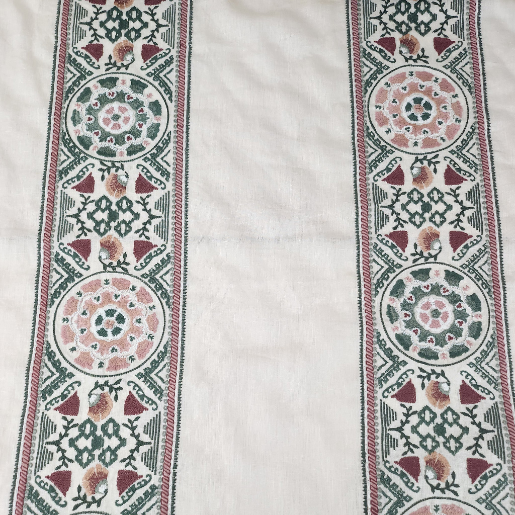 An elegant embroidered linen. The design features intricate patterns with embroidered detailing and decorative stripes.