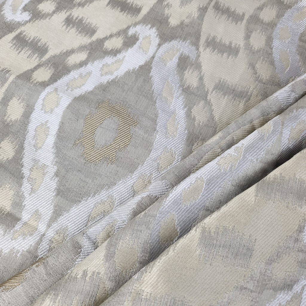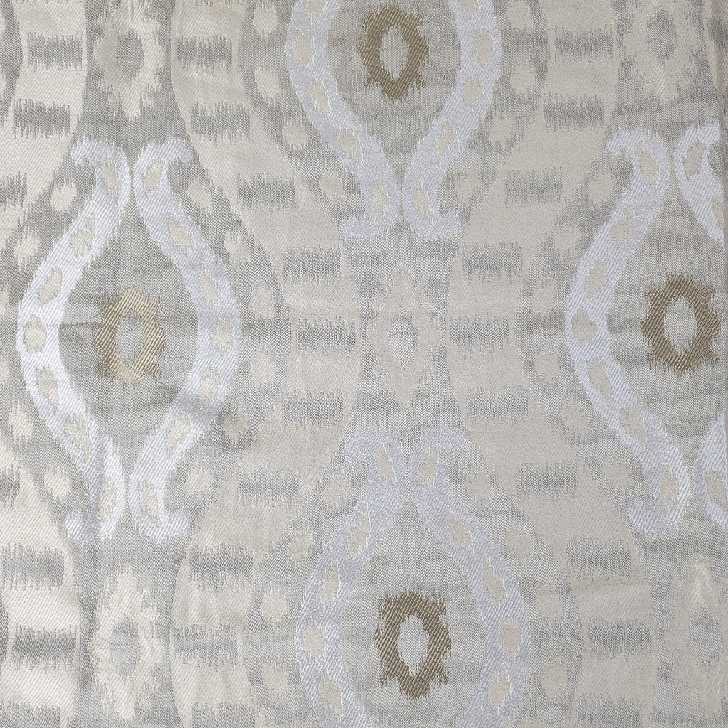 A woven jacquard with a classic Ikat ogee theme, enhanced with a metallic motif.