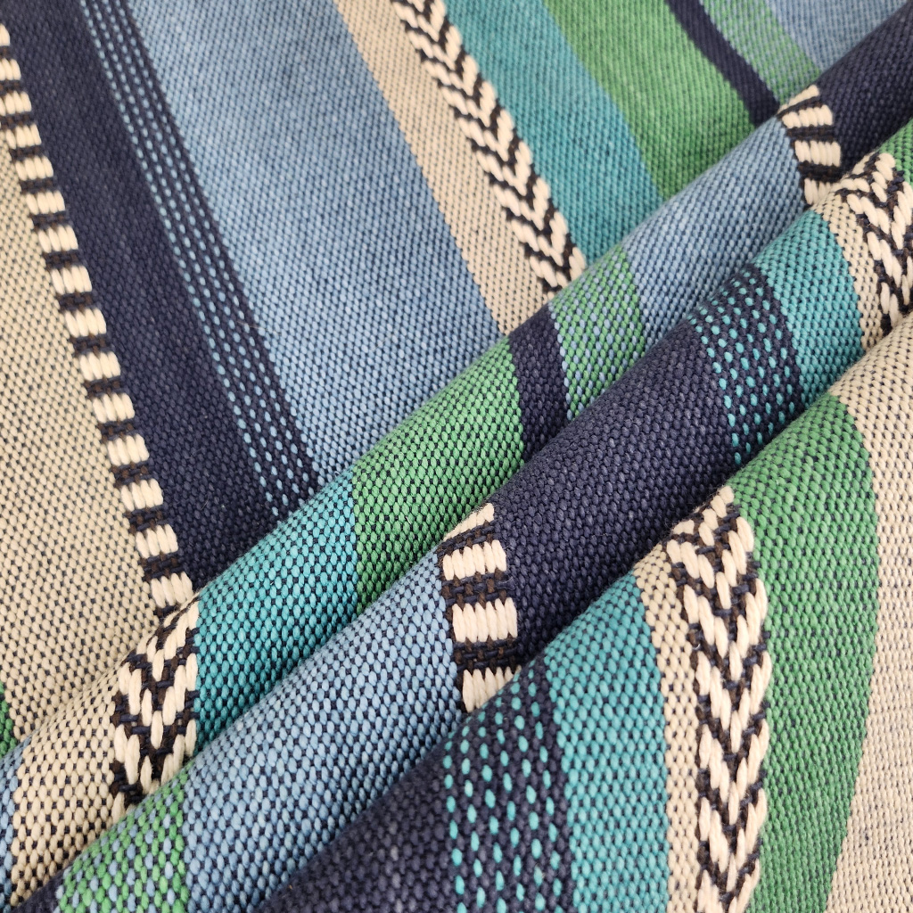 A heavy and rich stripe with a raised woven patterned detail, inspired by kilim rugs.