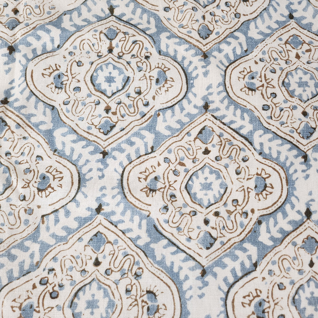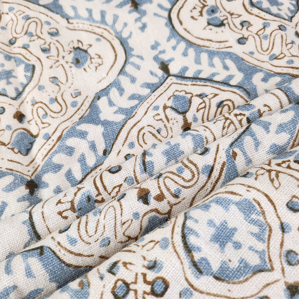 This distinctive, charming fabric with central motif design is printed on relaxed linen fabric.