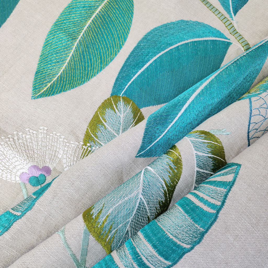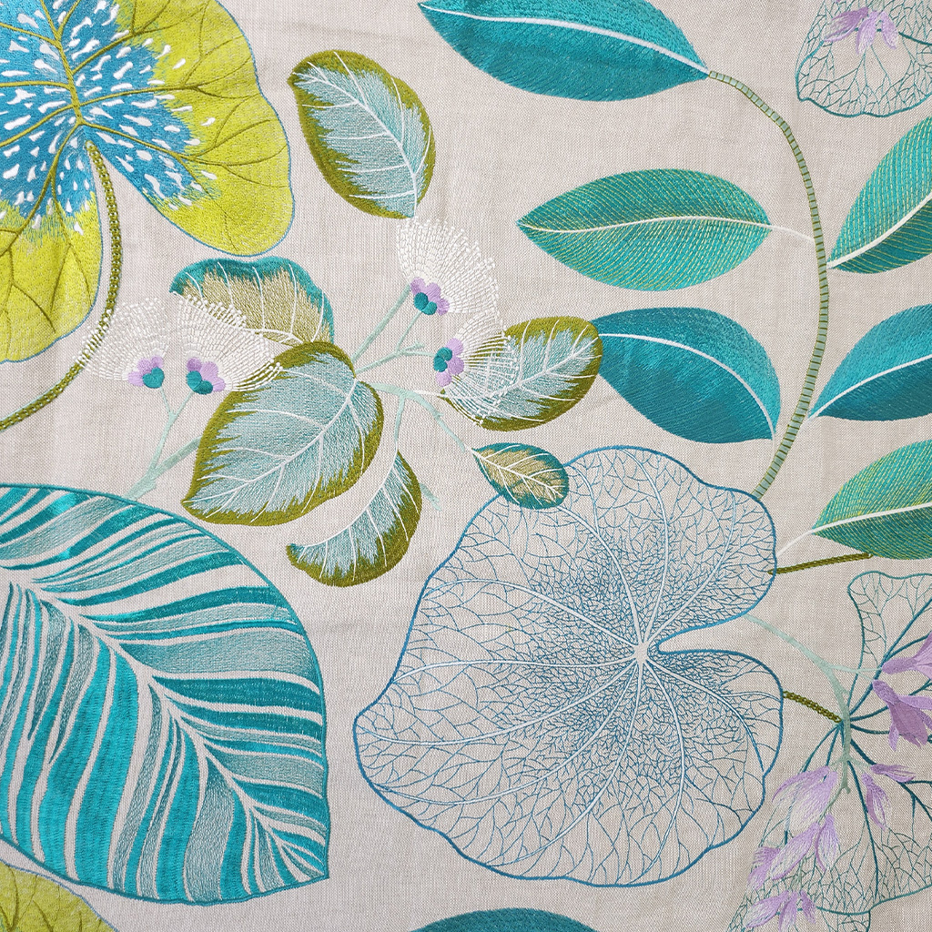 Exotic foliage is embroidered onto a linen fabric. It is slubbed and has a hand-woven appearance.