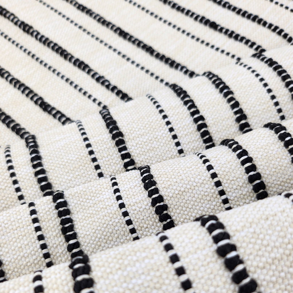Composed of interlocking yarns on a natural base, with a honeycomb style weave this outdoor fabric would work well in many schemes.