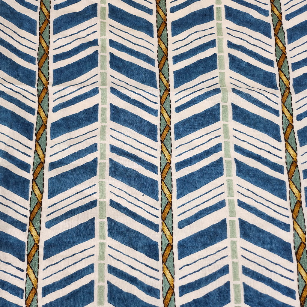 Diagonal stripes of colour are hand-block printed onto linen, with embroidered chevron pattern running down the fabric like bands of ribbon.