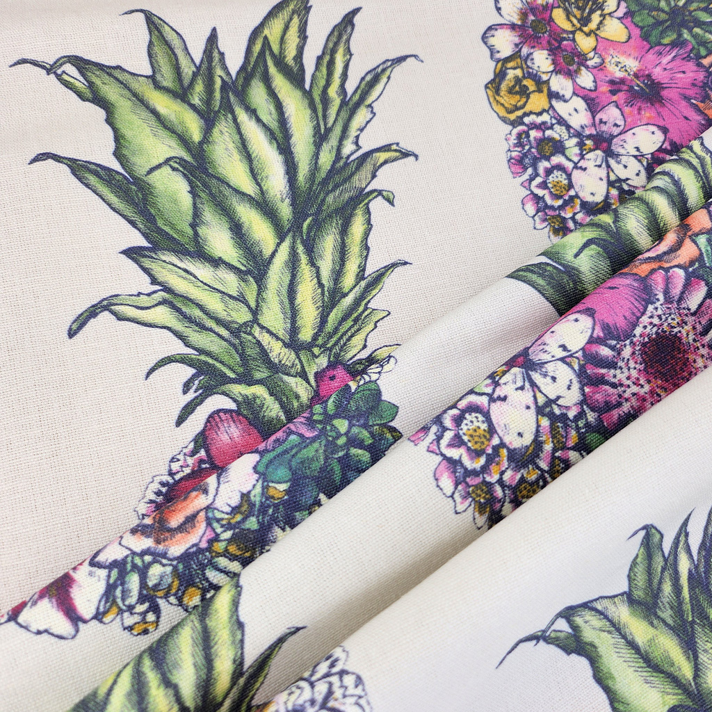 pineapples composed of flowers with colourful petals are printed onto linen to create this artistic fabric design.
