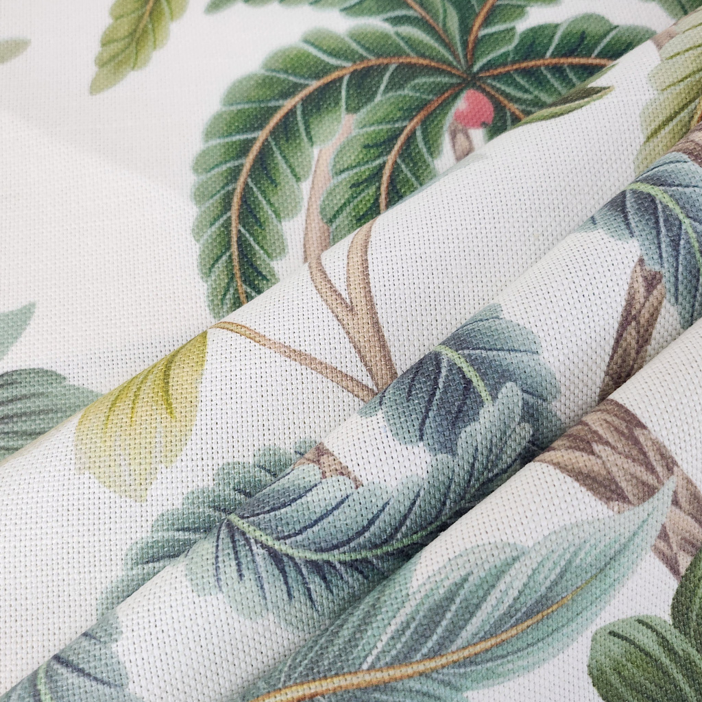 This botanical design of trailing coconut palms and intertwining leaves is printed on a linen/cotton ground.