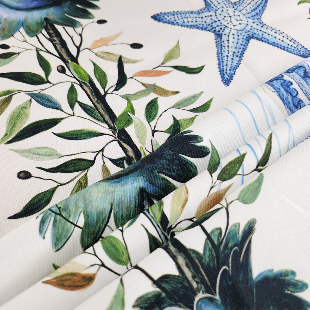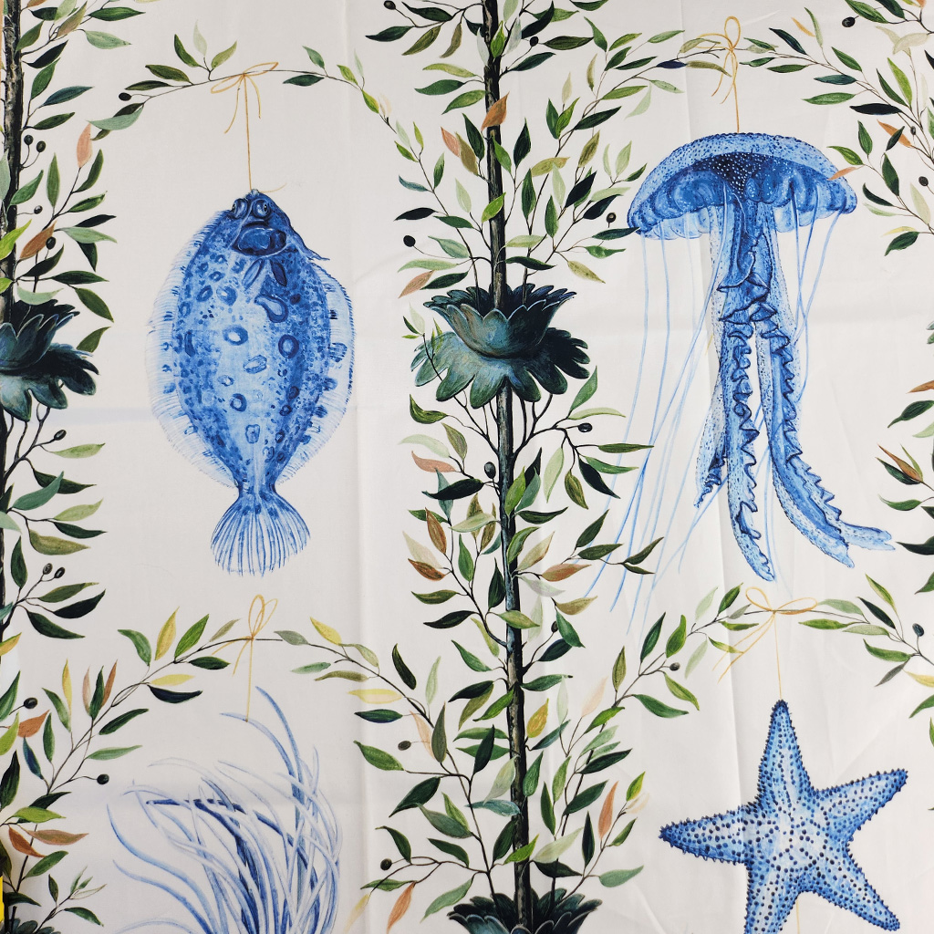 A cotton print with sea creatures, a modern day interpretation of the fishing trophies of the 18th century.