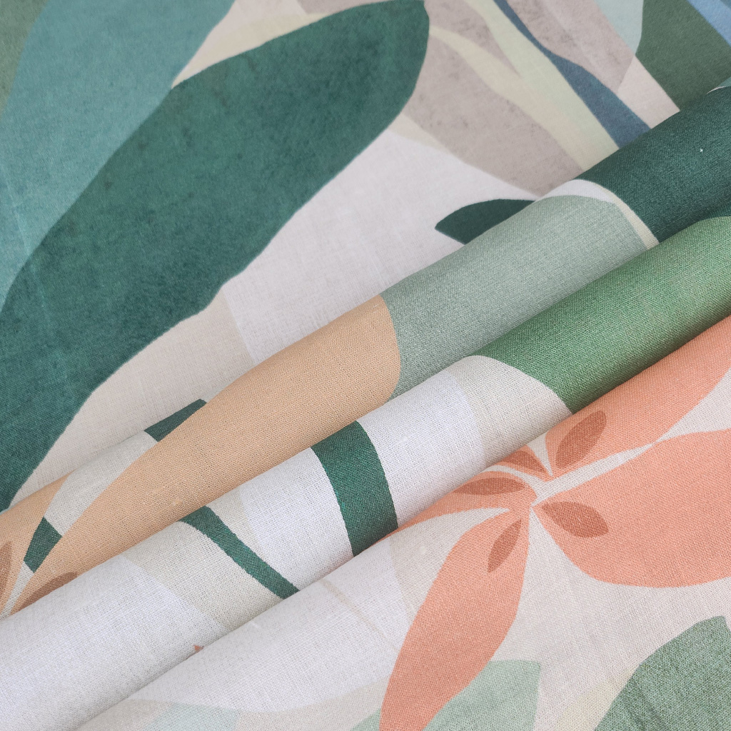 An abstract interlacing of orange blossoms from Mediterranean gardens, digitally printed on a linen cloth.