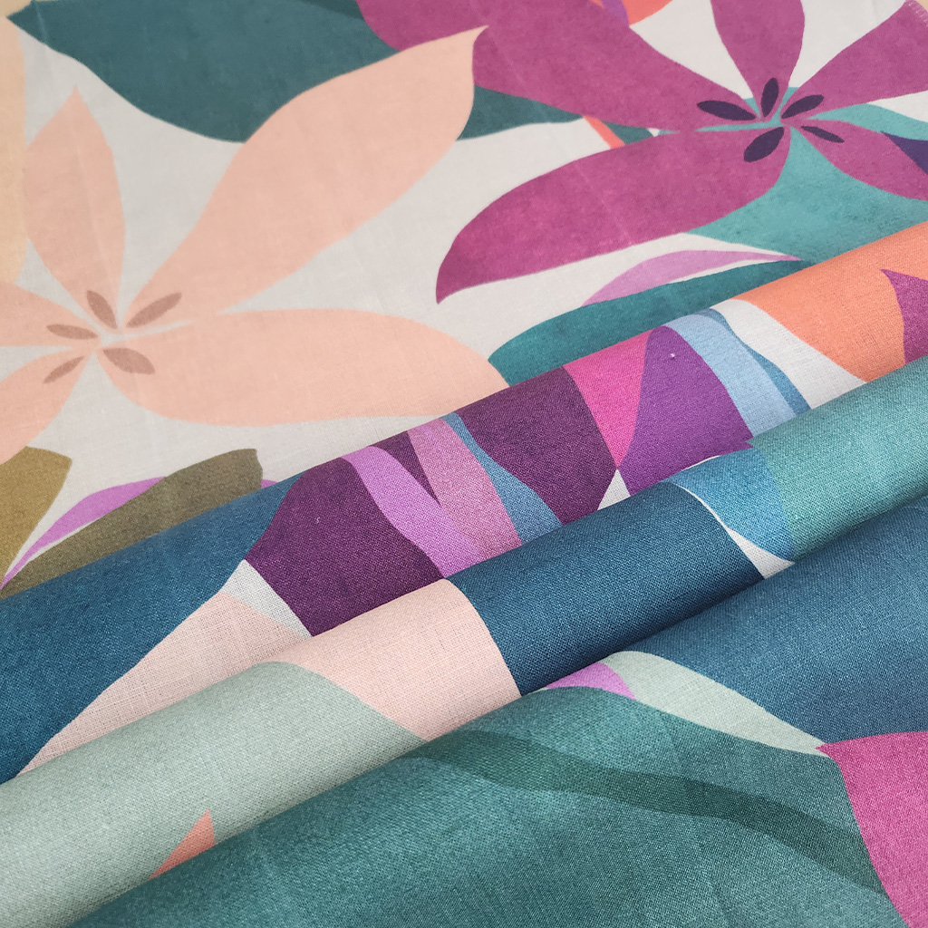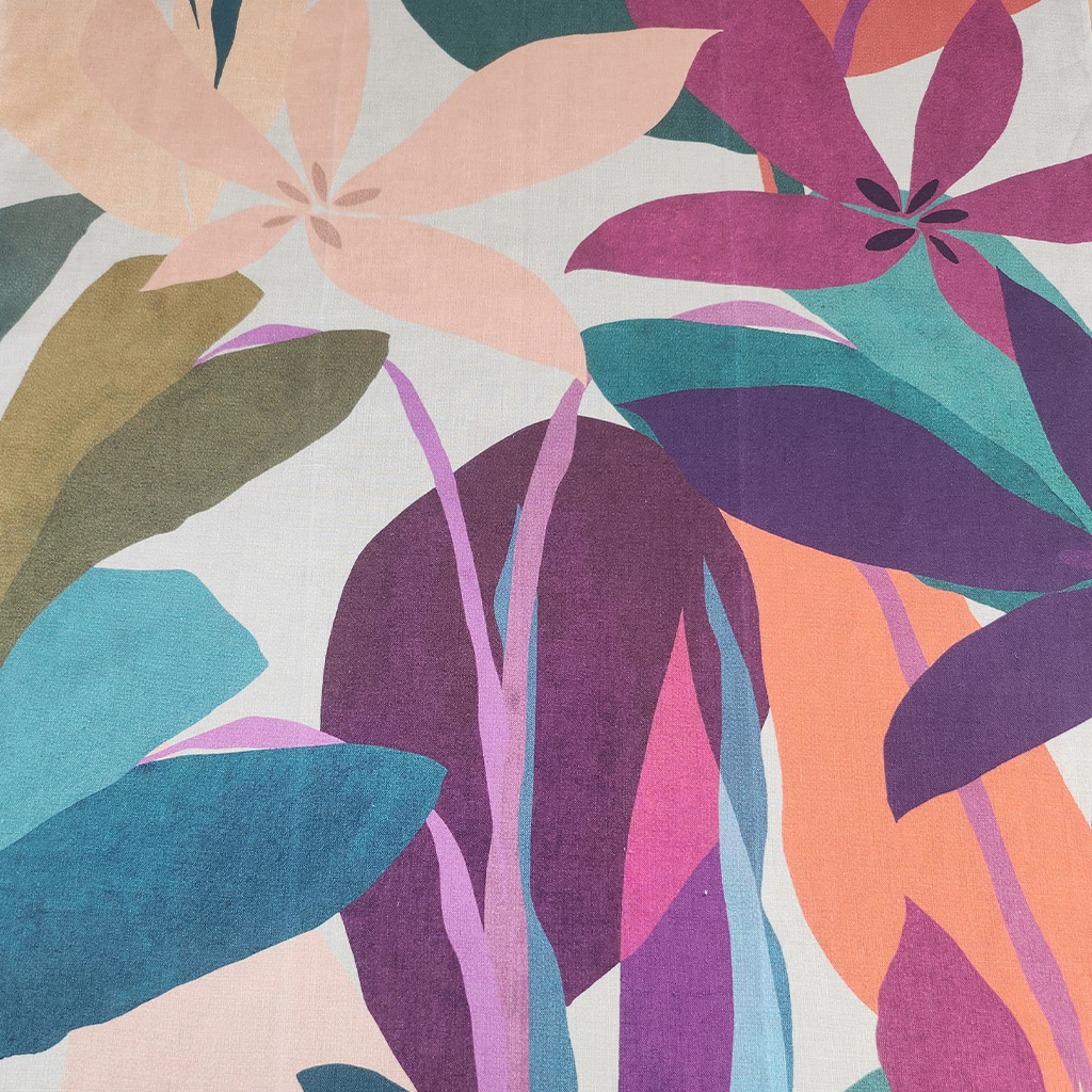 An abstract interlacing of orange blossoms from Mediterranean gardens, digitally printed on a linen cloth.